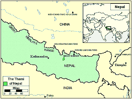 The Thami were originally a nomadic tribe that settled just to the east of Katmandu, Nepal's capital. Legend says that the first Thami couple had seven sons and seven daughters. When the parents could not find suitable marriage partners for their children, they allowed them to intermarry. The Thami tribes are their descendants.