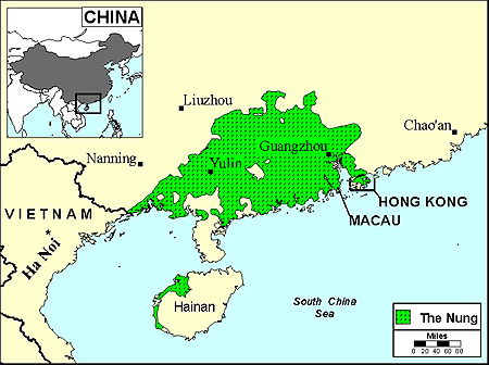 The peoples of China represent an amazing blend of cultures and languages. In the southeastern provinces, most inhabitants are Chinese Nung, part of the Han Chinese majority of China. While they were not the first inhabitants of this area, the Chinese Nung (also known as the Cantonese) arrived many centuries ago. Now there are 54 million Chinese Nung occupying the areas of Guangdong and Guangxi Provinces, including the important city of Canton. While they make up only 4.5% of the overall Chinese population, they are the third largest ethnic group in The People's Republic of China.