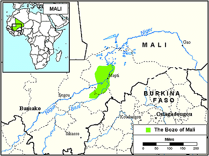 The 113,600 Bozo are a tribe of fishermen located in the town of Djene in the middle Niger River area. As the original inhabitants of the flood plains of the Niger and Bani Rivers, they allowed Djene, a trading town, to be built in their territory about 900 years ago. Although the Bozo control the waterways in much of their region, the land is dominated by other tribes who have migrated into the town.