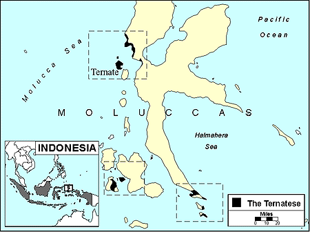 The large island of Halmahera lies in the northern Molucca (or Spice) Islands, midway between northern Sulawesi and the western tip of Irian Jaya. Together with its outlying islands (including Ternate), it covers approximately 6,500 square miles. The term "Ternatese" refers to those people who reside on the island of Ternate, as well as to those who have emigrated elsewhere but still identify themselves as Ternatese. Over the years, there has developed a history of physical and cultural assimilation in the area due to foreign competition for the Moluccan spice trade.