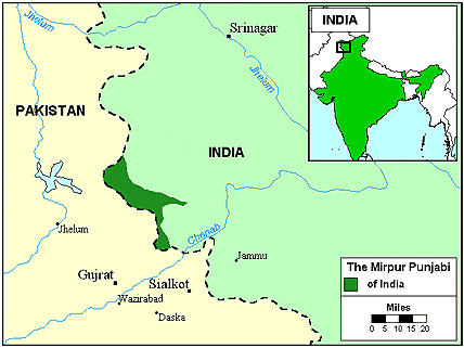 The term "Punjabi" is used to describe both those who speak Punjabi and those who inhabit the Punjab region of India and Pakistan. It is derived from the Persian words panj (five) and ab (river). Punjabi is an Indo-European language having six main dialects. The 935,000 Mirpur Panjabi speakers live in the Mirpur region of Kashmir, near the Pakistan border. Their language is distinct from, but related to, Western Punjabi.